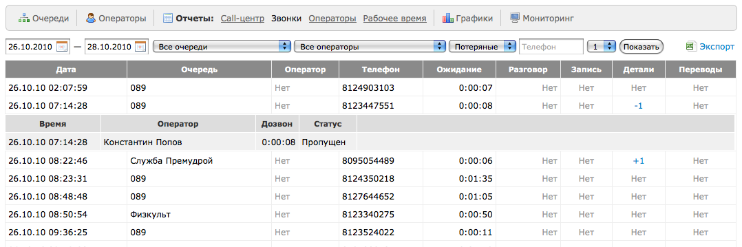 Например в отчете фильтруем по "потерянным" и видим их детали. В первой строке в очереди не было операторов, поэтому нет деталей. Во второй строке раскрыта детализация, у оператора звонил телефон, но он не успел.